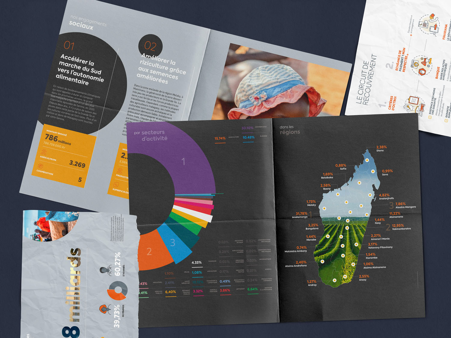 Nous avons également intégré la conception d’infographies et la mise en avant de statistiques clés pour rendre les résultats facilement compréhensibles et visuellement attractifs. Les rapports ont été repensés de façon intuitive, avec une hiérarchisation claire de l’information, des visuels synthétiques et des mises en pages accessibles, afin de faciliter la lecture par les décideurs, partenaires et bénéficiaires.